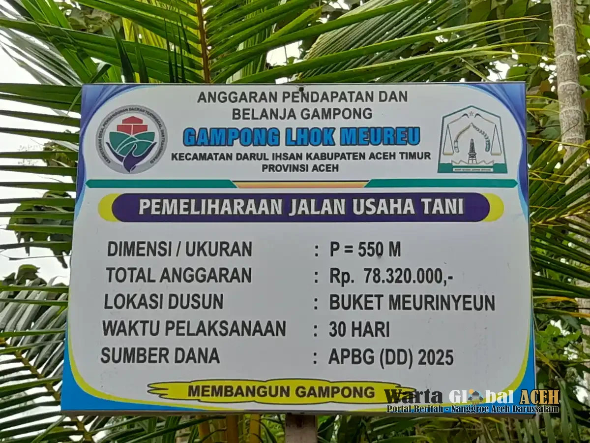 Aceh Timur .Wartaglobal.com |Gampong Lhok Meureu Sedang Kerjakan Jalan Usaha Tani dengan Paku Anggaran APBG Tahun 2025 Sebesar 78.320.000 juta, yang bertempat di Dusun Buket Meurinyeun, Kecamatan Darul Ihsan,Pengerasan Jalan Usaha Tani (Pangan) dengan Menggunakan unit mobil alat berat Gledeer,Kompek,dan Timbunan batu Sertu dengan panjang 550 meter Lebar 4 meter dengan berbatasan dengan Seneubok Aceh.Hari Sabtu Tgl (11/10/2025)
