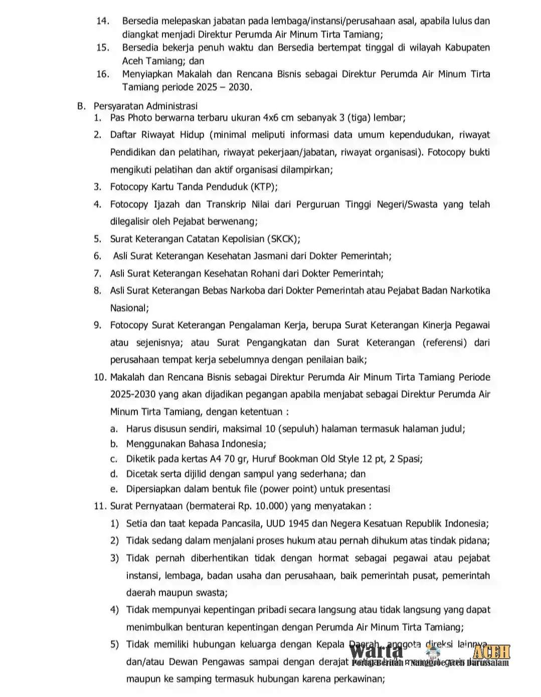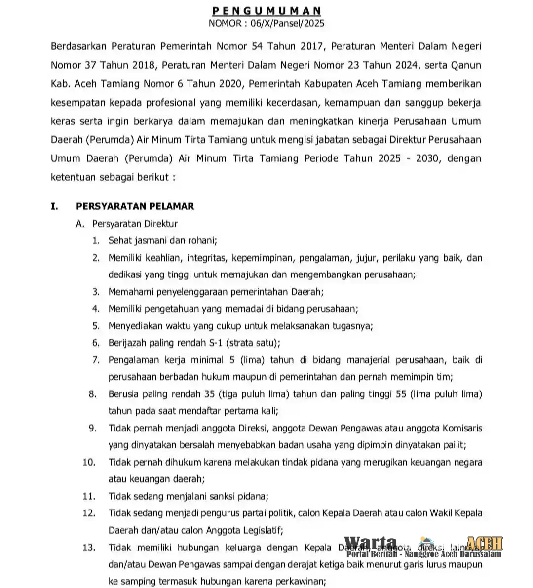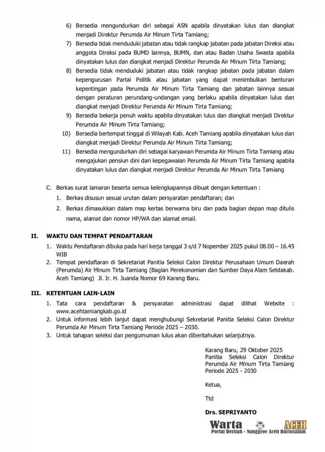 Dalam pengumuman tersebut, disebutkan bahwa proses seleksi ini terbuka untuk umum kategori peserta, serta masyarakat umum yang memenuhi persyaratan yang ditentukan. Hal ini menunjukkan komitmen Pemkab Aceh Tamiang dalam mendorong transparansi dan kompetensi dalam pengisian jabatan strategis di tubuh perusahaan daerah. Pendaftaran dibuka, mulai dari tanggal 03 s/d 07 November 2025.
