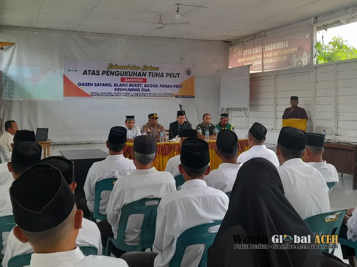 Aceh Timur. Wartaglobal.Id | Camat Iskandar Syah SE M.AP Kecamatan Darul Aman Kabupaten Aceh Timur Melaksanakan Pengukuhan Tuha Pheut , Empat ( 4 ) Gampong Sekaligus, Yakni :