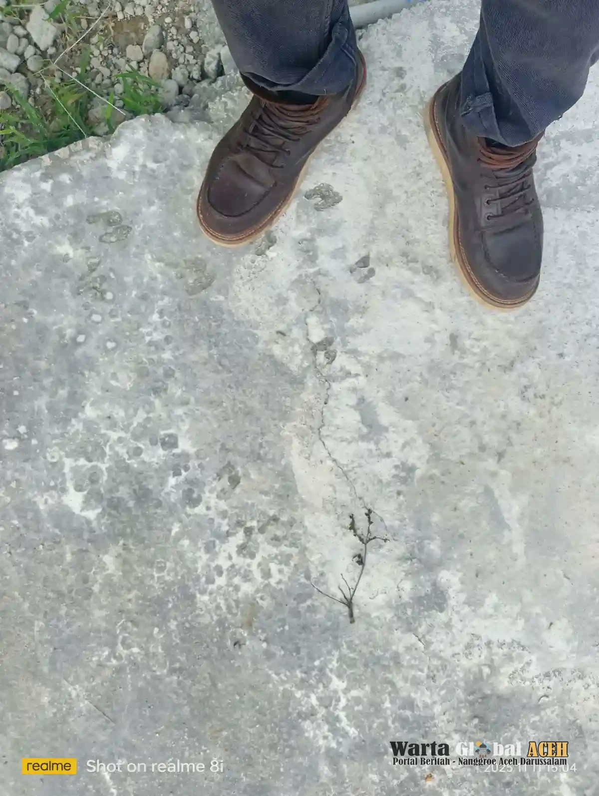 Permukaan beton terlihat mudah hancur, adanya keretakan di sejumlah titik diduga campuran material tidak sesuai komposisi teknis.