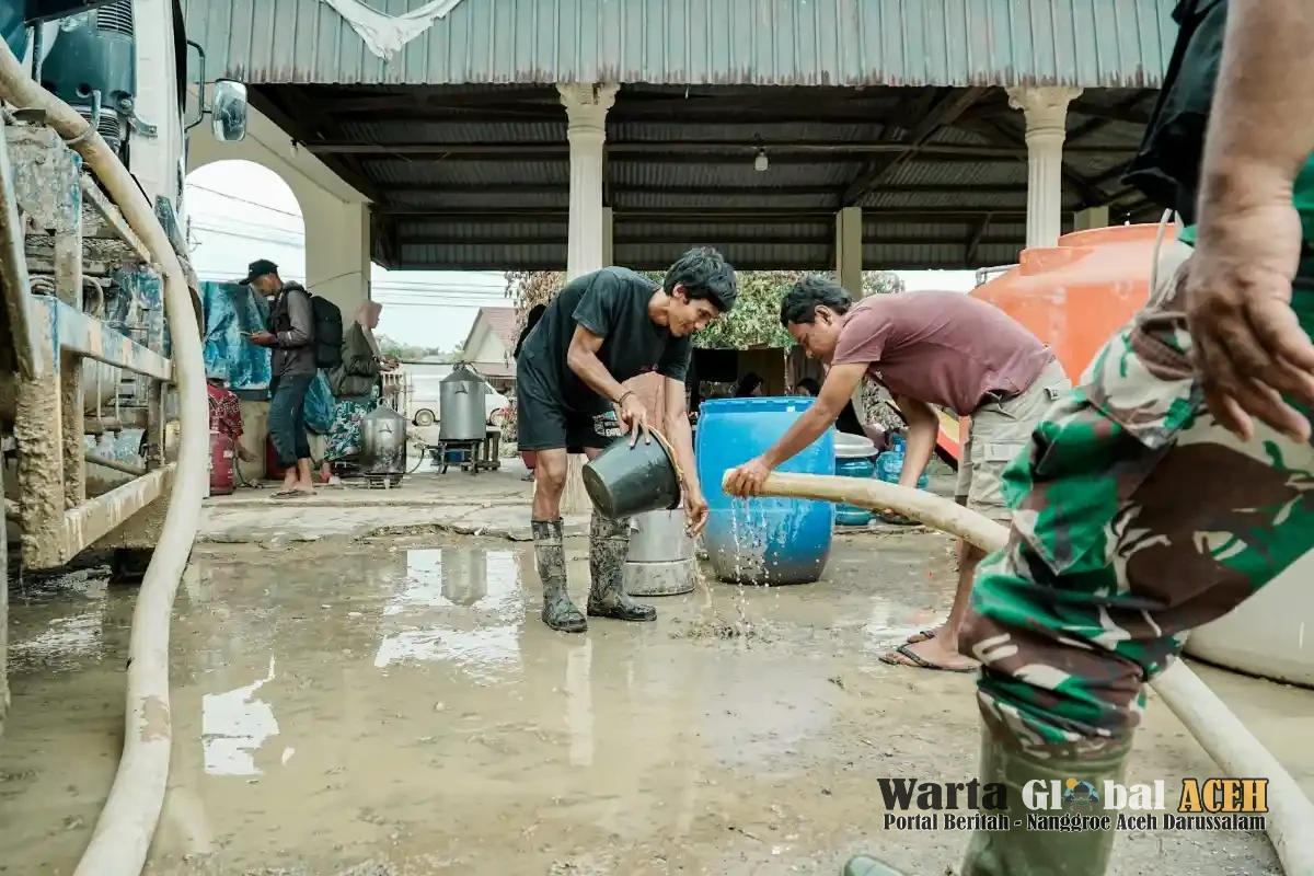 ACEH TAMIANG, 28 JANUARI 2026- AIR mengalir deras dari selang truk tangki berukuran 2,5 sentimeter. Beberapa tandon air (tempat menampung air bersih) dan puluhan ember seketika penuh. Para warga seperti balas dendam pada kekurangan air pascabanjir besar memorak-porandakan desa mereka. Rabu, 04/02/2026