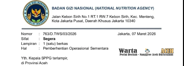 Bukan hanya Aceh Tamiang, Dapur SPPG dibeberapa provinsi Aceh di kabupaten lainnya seperti Aceh besar, Aceh Selatan, Aceh Singkil, SPPG Aceh Timur, juga diberhentikan sementara operasionalnya dan terlampir dalam surat yang dikeluarkan oleh Badan Gizi Nasional Republik Indonesia (BGN-RI) dengan nomor : 763/D.TWS/03/2026.