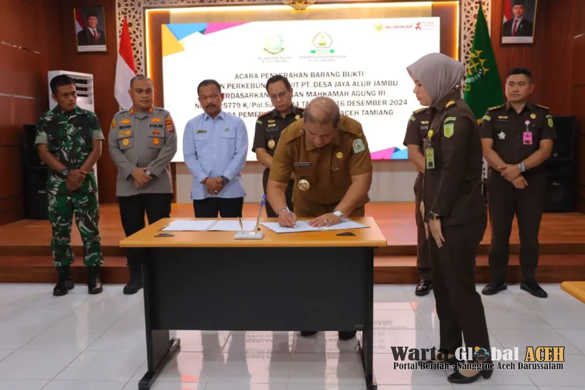 Aceh Tamiang — Bupati Aceh Tamiang, Irjen Pol. (P) Drs. Armia Pahmi, MH, secara resmi menerima penyerahan aset berupa barang bukti lahan sitaan negara seluas 429 hektar dari Kejaksaan Negeri (Kejari) Aceh Tamiang. Penyerahan aset perkebunan kelapa sawit dari kasus PT. Desa Jaya Alur Jambu ini dilakukan di Karang Baru, Aceh Tamiang, pada Selasa (21/10/25).