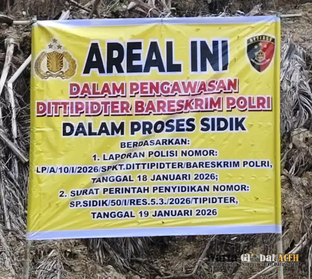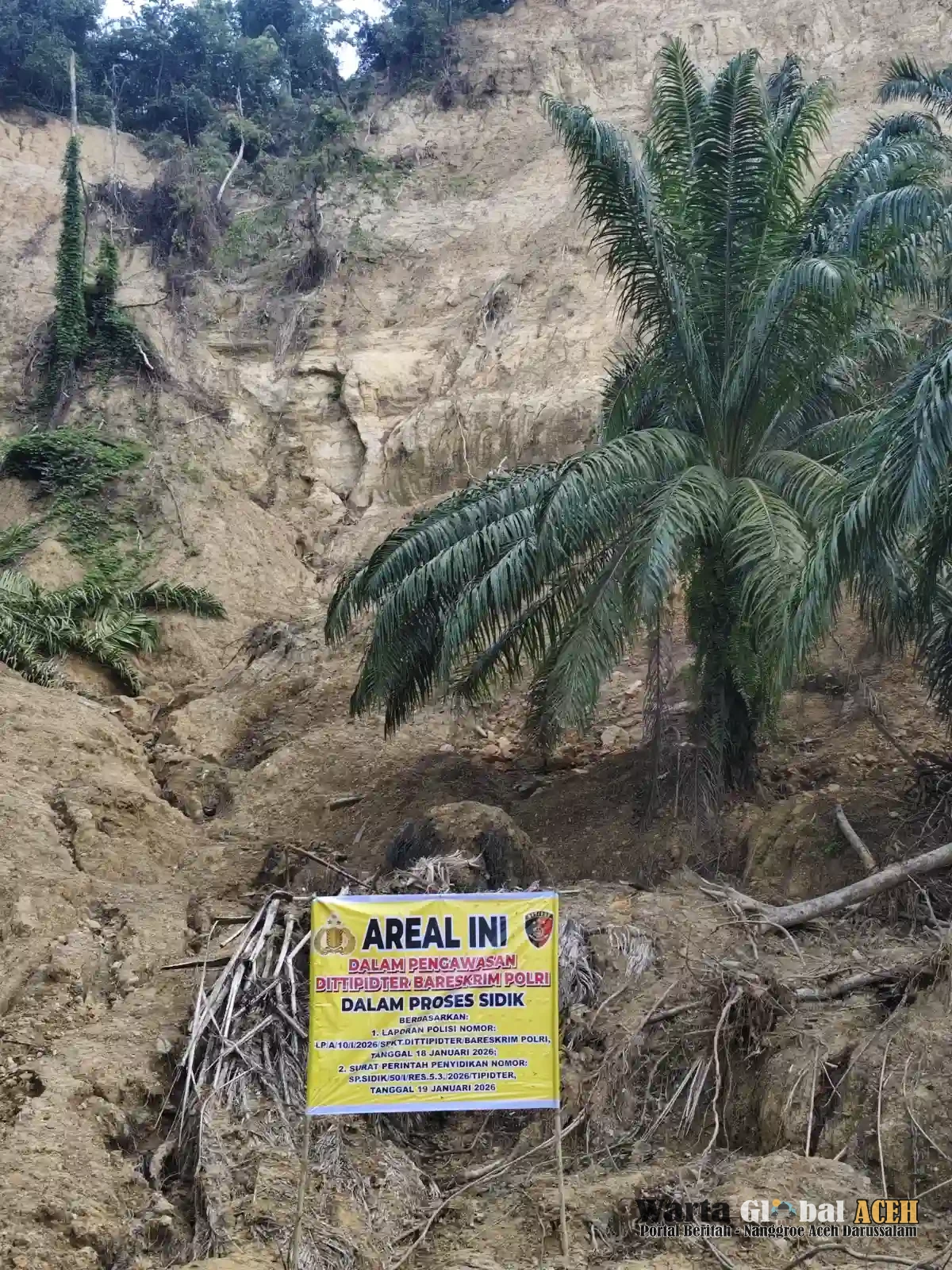Diketahui plang berwarna kuning berlambang Polri dan Bertuliskan Areal ini dalam pengawasan DITTIPIDTER Bareskrim Polri .